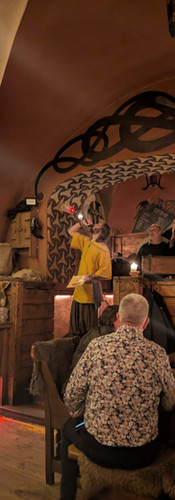 Du möchtest mal wie ein echter Wikinger Speisen dann bist du hier genau richtig. denn im Aifur kannst du ein echtes kulinarisches Erlebnis erleben. Tauche ein in die Welt der Wikinger und nehme Platz auf einen der Holzbänken des Lokales und genieße einen Abend voller Leichtigkeit und Wikinger touch. Schon begrüßt wirst du ganz anders als in anderen Restaurants denn hier wirst du von einem Kellner im Wikinger Style begrüßt und dieser bläst in ein Horn und steht dich den anderen Gästen vor dann wirst du an deinem Platz begleitet. Speisen tust du auch wie ein echter Wikinger mit einer Forke und keiner Gabeln. So einspeisen wird echtes schwedisches Brot gereicht (Knäckebrot). Essen kannst du hier wie ein Wikinger und natürlich typisch schwedisch unter anderem kannst du Vorspeiseplatten mit schwedischen Braten und Wurst (Elch, Reh und Rentier) genießen oder dich auf Frank frischen Fisch freuen, auch vegetarische Speisen werden hierzubereitet denn auch schon die Wikinger haben vegetarisch gemacht doch gibt es hier andere gemüsesorten als dir vielleicht vertraut sind unter anderem wird viel gerne mit Schwarzwurzel (der "ostdeutsche" Spargel) und zuckerschoten gearbeitet. Dein Essen genießt du in einer Wikinger Atmosphäre wunderbar urig und in fröhlicher Gesellschaft dazu gibt es traditionelle Hausmusik von damals. Auch die Getränke sind typisch im wikingerstil und werden auch in speziellen Gläsern bzw Krügen der wikingerzeit gereicht. Besonders belebt ist hier im Met (Honigwein). Der Besuch hat uns wirklich begeistert und war eines unserer ganz persönlichen Highlight dieser Reise einem Besuch in so einem erlebnisrestaurant können wir euch nur ans Herz legen wenn ihr in Stockholm seid solltet ihr das auf alle Fälle mal mitmachen! Da dieses Highlight kein Geheimtipp mehr ist solltest du unbedingt vorab reservieren denn die Wikinger Erlebnisrestaurants in Stockholm sind immer gut besucht und wie gesagt ein echtes Abenteuer! Dass wir eine Menge Spaß haben kannst du nun in den Bildern sehen - schau selbst: